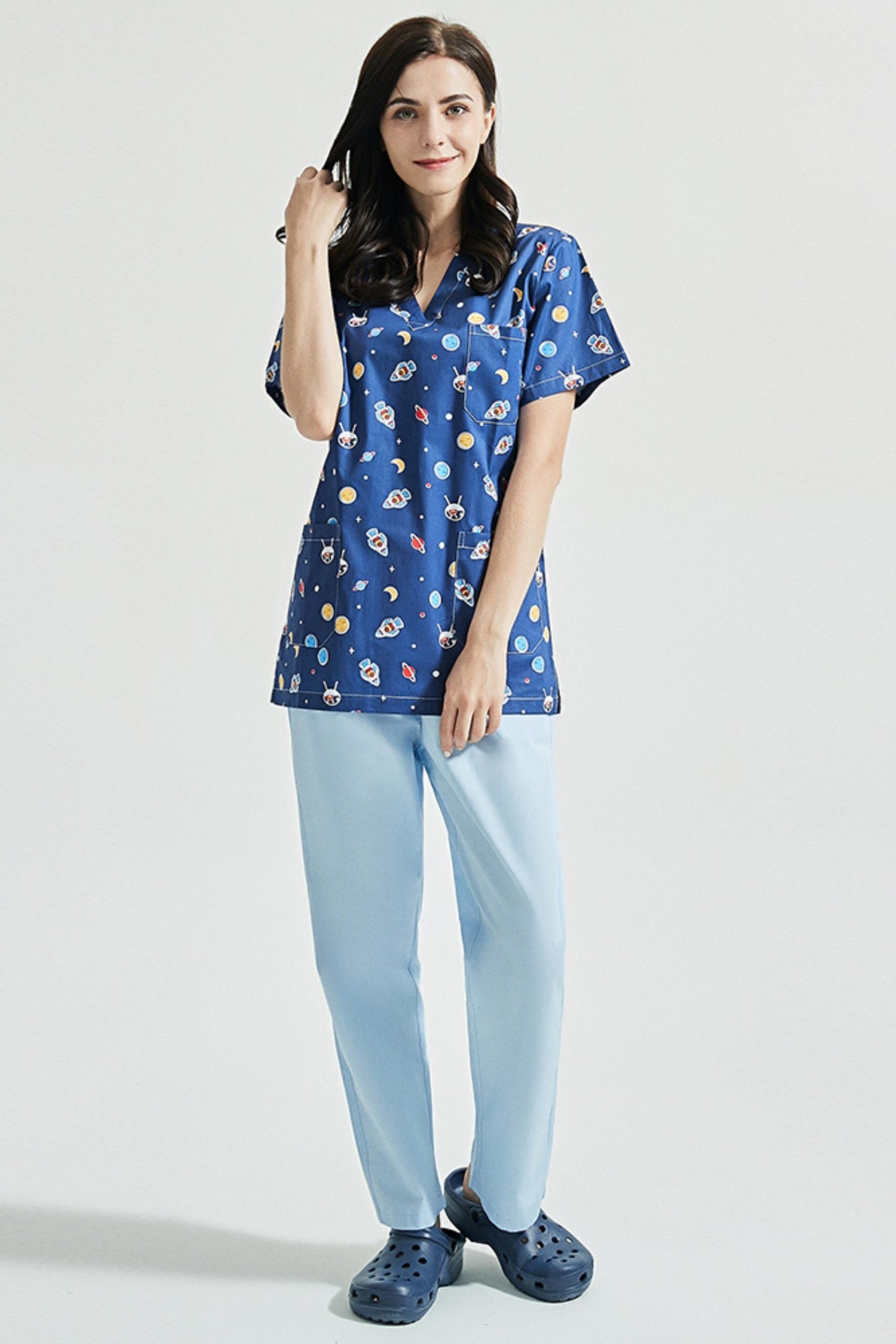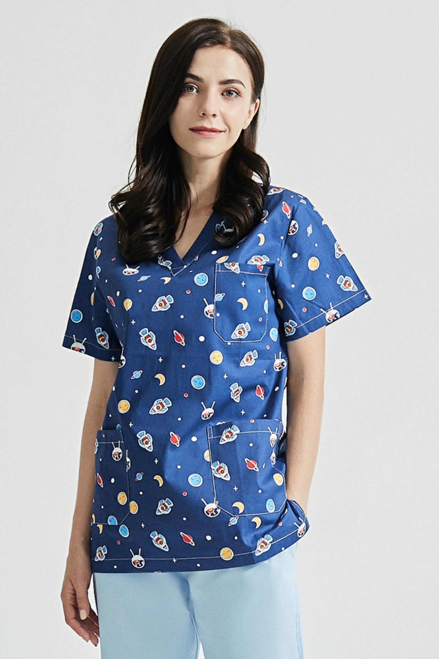 Medizinische Tunika mit kurzen Ärmeln aus 100 % Baumwolle mit modernen Mustern, um Ihre Patienten aufzuheitern.