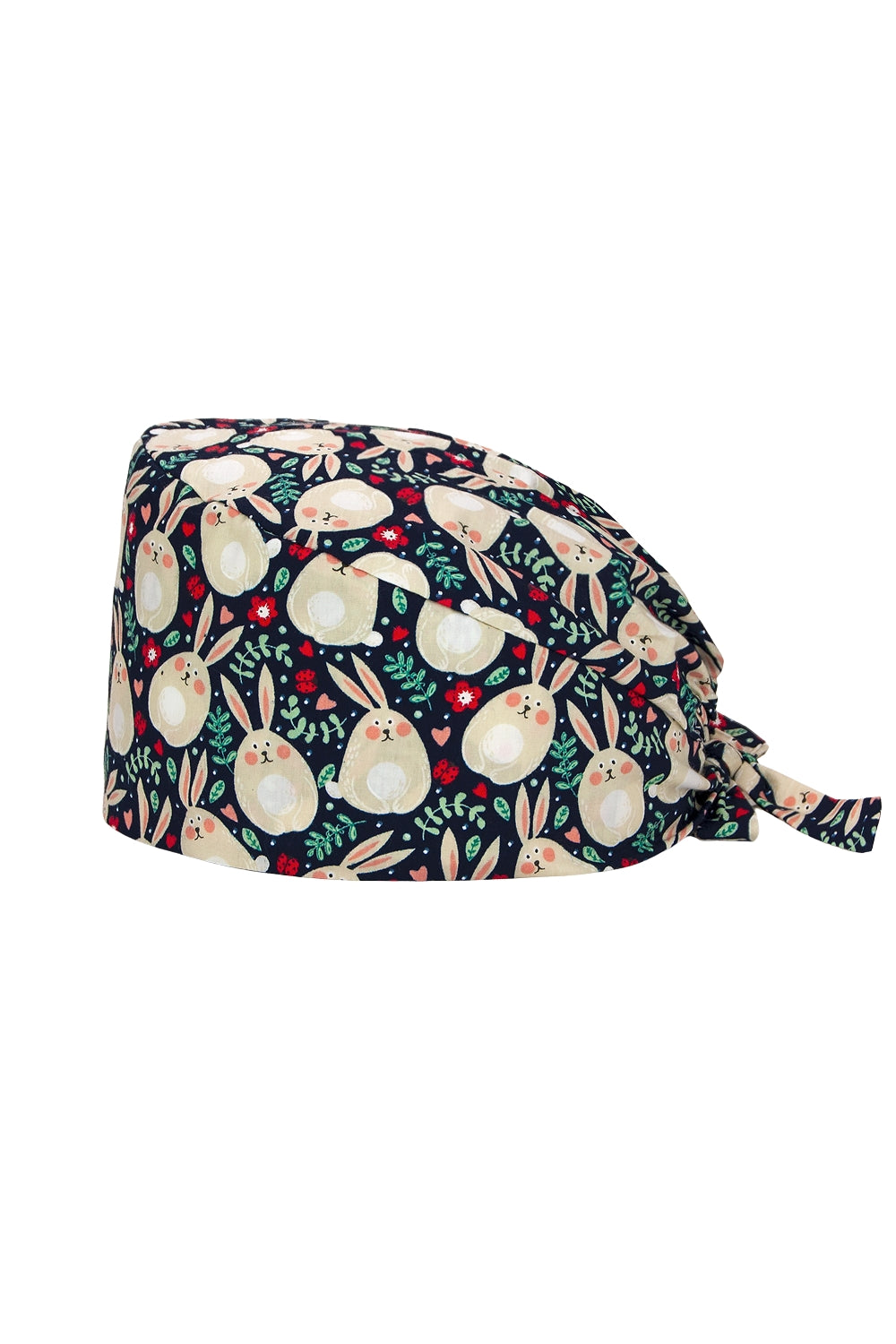 OP-Haube aus Stoff mit Muster – Marineblau mit Hasen- und Blumenmotiv