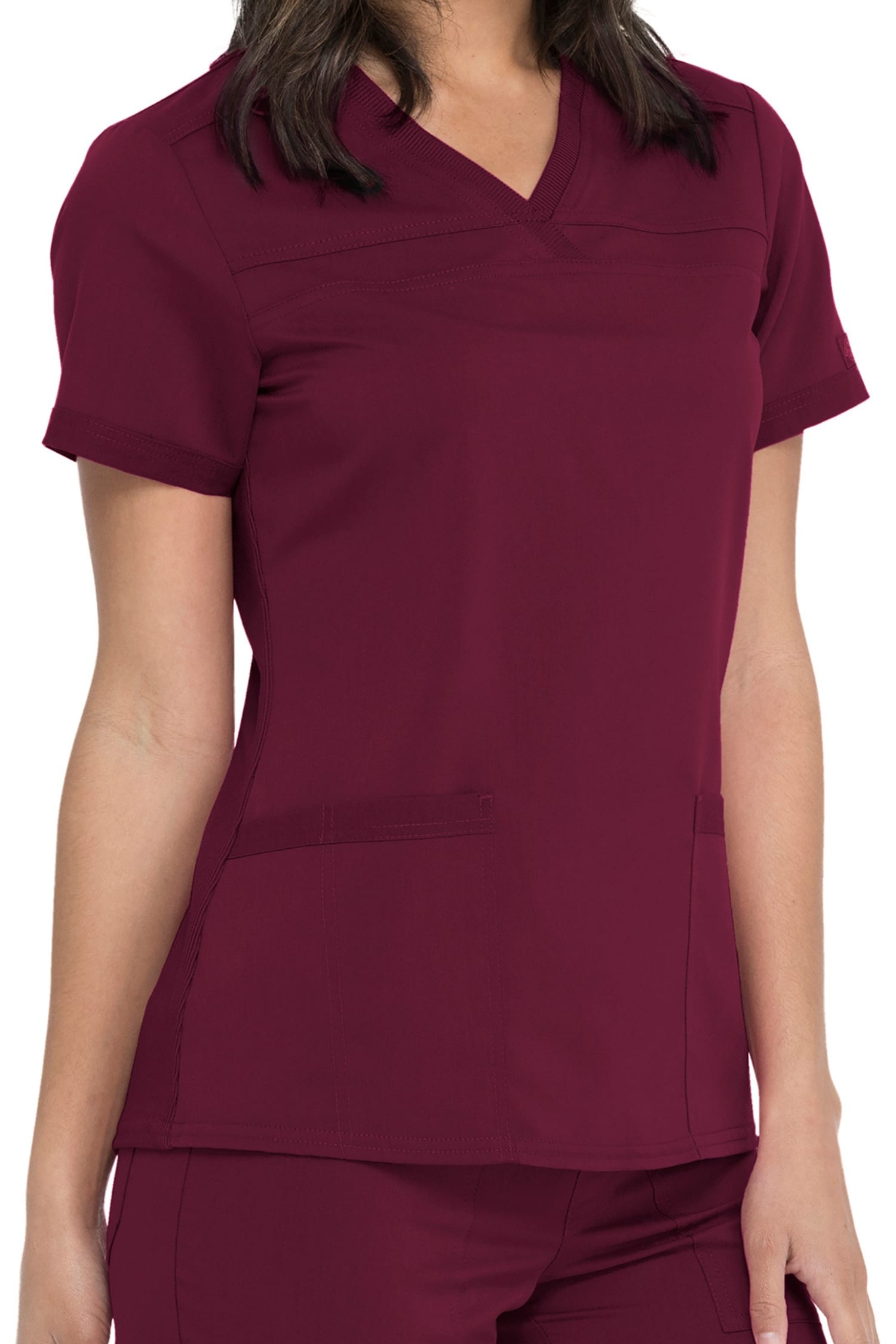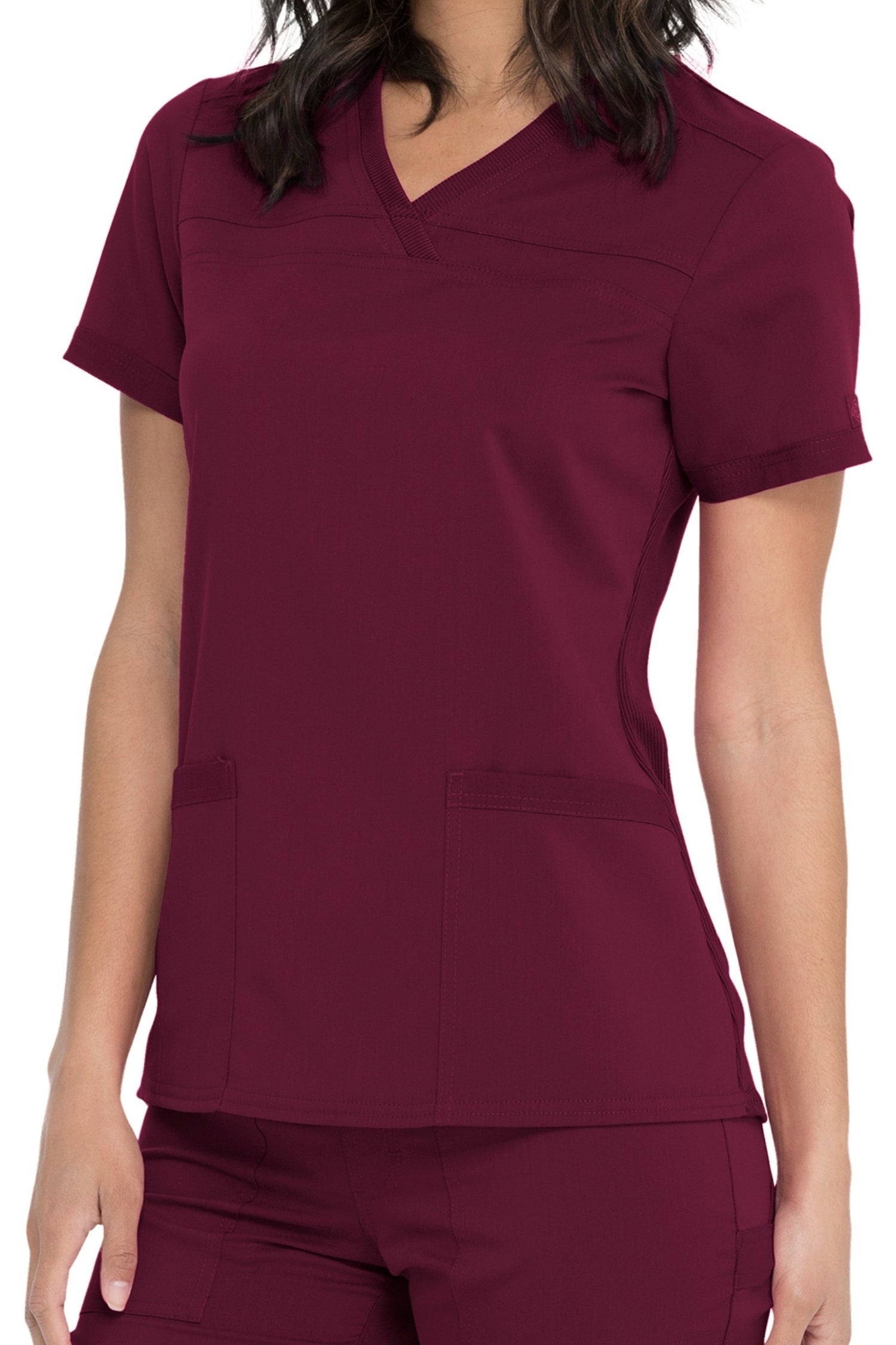 Ce haut élégant à col en V présente un col en tricot, deux poches plaquées à l'avant, des parties en tricot au dos pour le confort. Une boucle élastique a été ajoutée à l'empiècement droit pour maintenir votre badge d'identification dans la position idéale. Coupe contemporaine.
