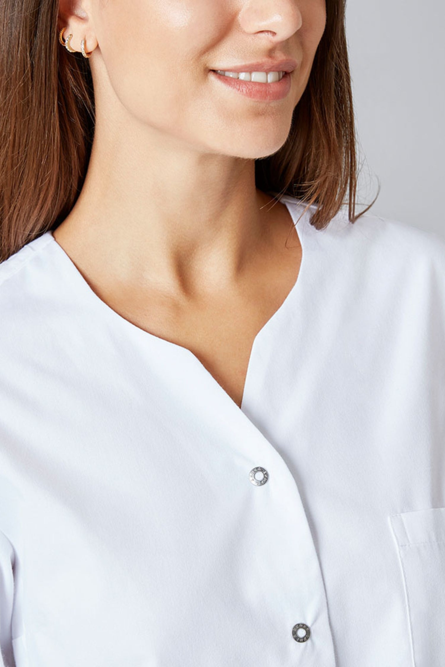 Egal ob Sie Pflegekraft, Zahnarzt, Chirurg oder Arzt sind – diese Bluse mit langen Ärmeln, dekorativen Knöpfen und praktischen Taschen ist die perfekte Wahl, um Eleganz und Funktionalität in Ihrem Arbeitsalltag zu vereinen.